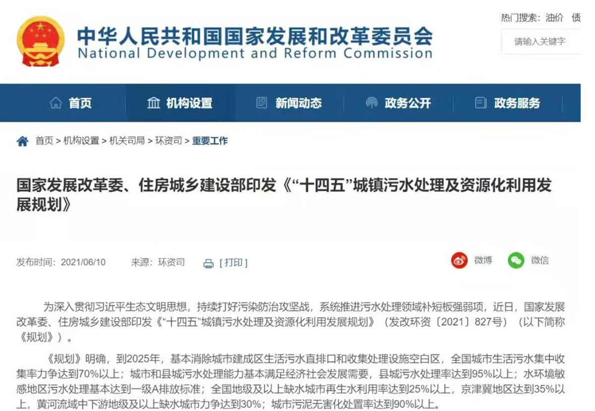 生态环境部所说的《“十四五“城镇污水处理及资源化利用发展规划》,已经于2021年6月发布。